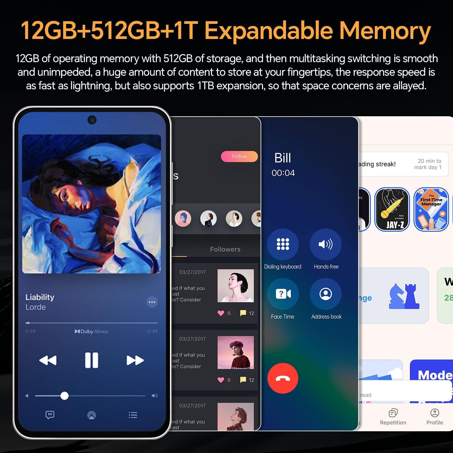 【5G Dual SIM Dual Standby + 1TB Expansion】 Supports dual-mode 5G network, dual nanoSIM card slots + independent TF card expansion slot design, up to 1.5TB (512GB + 1TB) storage capacity.