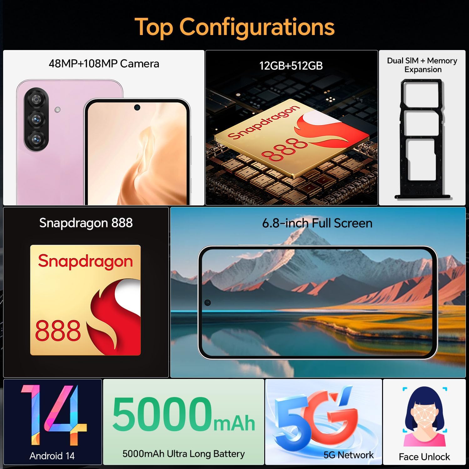 C56 Ultra 5G Unlocked Phones, Smartphone Android 14, 12GB+512GB Unlocked Android Phones, Snapdragon888, 5000mAh, 48+108MP Camera, 6.8“ HD Screen, Dual SIM+Memory Expansion