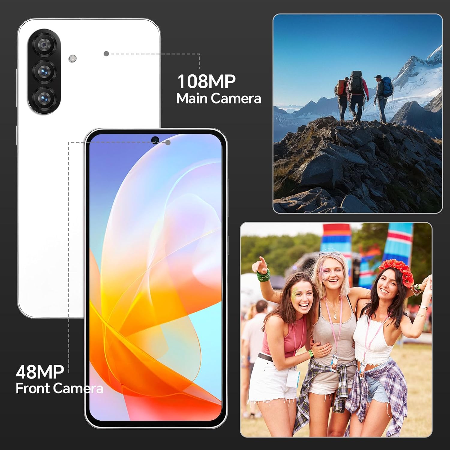 【108MP+48MP Camera+AI Face Unlocked】The Android phone comes with a 108MP main camera with enhanced image processing algorithms that make every photo exceptionally clear and detailed without being eye-catching or lifelike. The 48MP front camera further enhances the clarity and delicacy of facial features, helping you take creative selfies with accurate colors. Get your phone unlocked upon recognizing your face with AI face unlock.